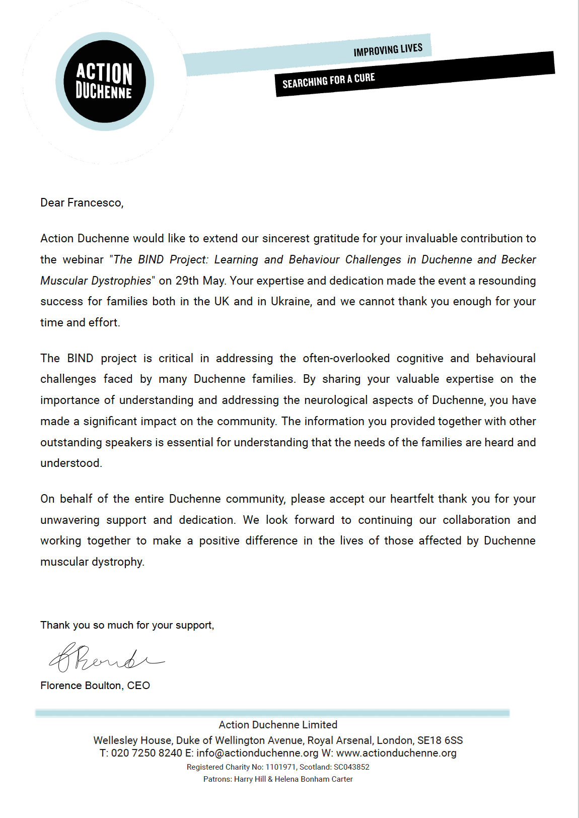 We are happy to share this thank you letter, expressing our gratitude for Prof. Muntoni’s contributions and the overall success of the event.