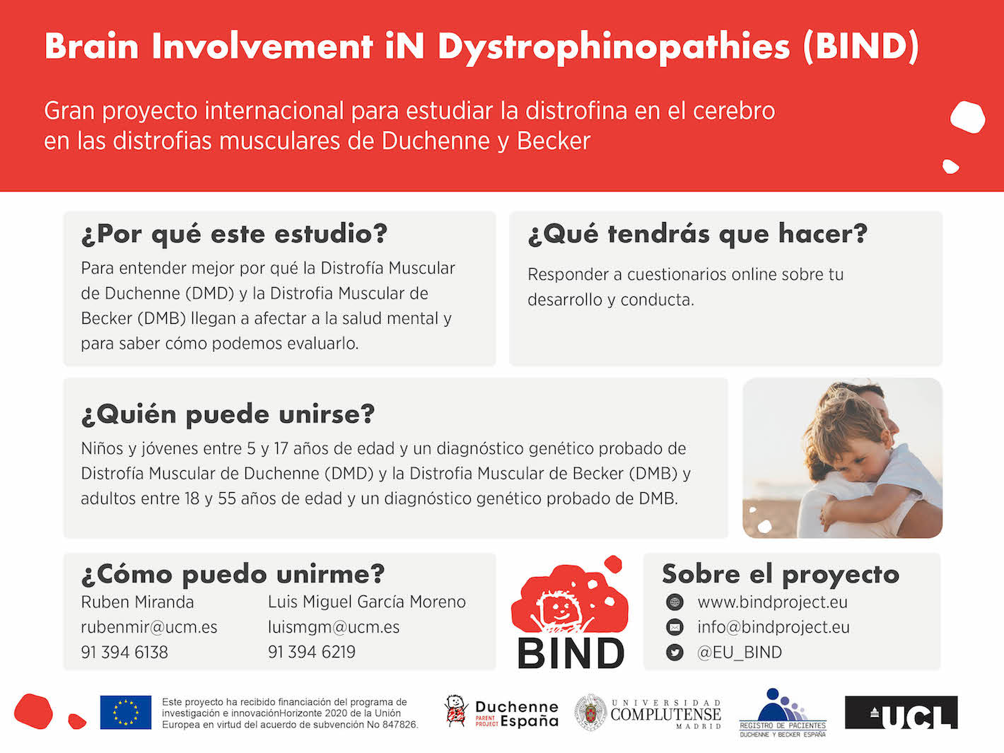 La Universidad Complutense de Madrid (España), bajo patrocinio de la University College of London (UCL), y en colaboración con Duchenne Parent Project-España y el Registro de Pacientes Duchenne y Becker España, está actualmente reclutando participantes varones de entre 5 y 50 años para tomar parte en un estudio online centrado en investigar cómo afectan la DMD y DMB a la salud mental y cómo poder valorar su impacto.